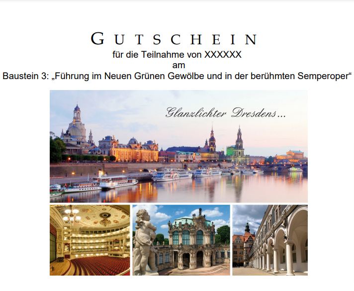 Wenn Sie einen Gutschein ohne ein bestimmtes Datum haben möchten, füllen Sie bitte das unten stehende Formular aus. Der Gutschein kann für die gewählte Leistung an Tagen, an denen wir die Führung anbieten, genutzt werden. (März bis Dezember am Mo / Mi / Fr / Sa). Eine nachträgliche Änderung ist ebenfalls möglich, selbstverständlich gegen zusätzliche Zahlung, falls die gewünschte Führung teurer ist als die bereits verschenkte. Wir bitten die Beschenkten, sich vor der Nutzung des Gutscheins bei uns telefonisch oder per Email anzumelden, damit wir es einplanen können. Es ist besonders wichtig für die Programme die eine Semperoperführung beinhalten, weil diese von dem Proben- und Spielplan der Oper abhängig sind. Die Gäste können gern auch die genau Verfügbarkeit im Buchungsformular nachschauen.
